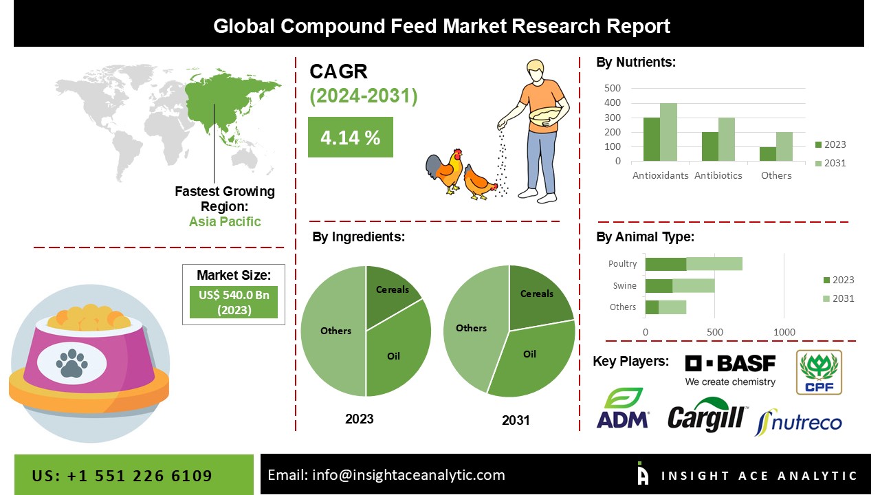 The Compound Feed Market Size was valued at USD 540.0 Bn in 2023 and is predicted to reach USD 738.91 Bn by 2031 at a 4.14% CAGR during the forecast period for 2024-2031.