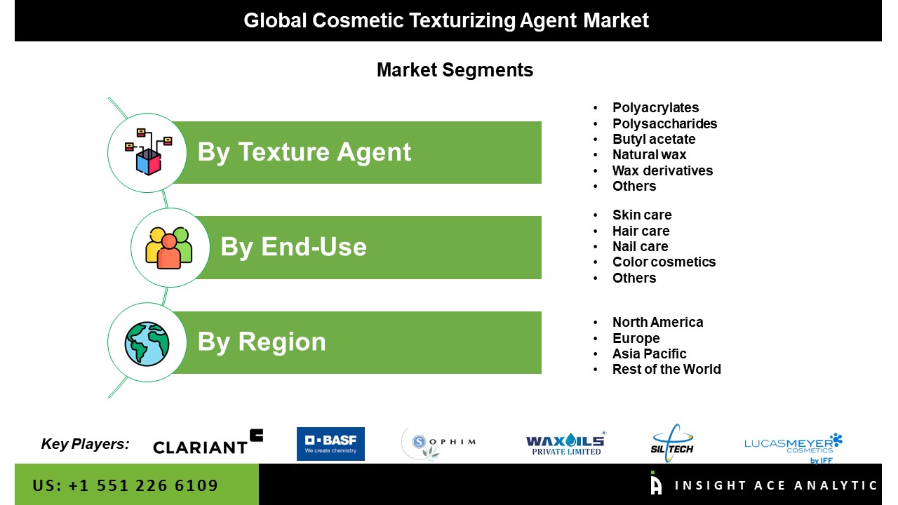 The Cosmetic texturizing agent market is segmented based on texture agent and end-use. Based on product, the market is segmented as polyacrylates, polysaccharides, butyl acetate, natural wax, wax derivatives, oils (palm, castor, and others), vegetable butters (shea, almond, jojoba, cocoa, and others), vegeline, and others. Based on end-use, the market is segmented as skin care, hair care, nail care, color cosmetics, and others.