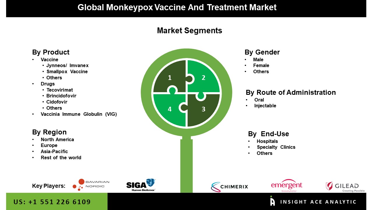 The Monkeypox Vaccine And Treatment market is segmented on the product, route of administration and end-use. Based on product, the market is segmented into Vaccines (JYNNEOS/ Imvanex, Smallpox Vaccine, Others), Drugs (Tecovirimat, Brincidofovir, Cidofovir, Others) and Vaccinia Immune Globulin (VIG). Based on gender, Monkeypox Vaccine And Treatment market is segmented into males, females and Others. Based on the route of administration, the Monkeypox Vaccine And Treatment market is segmented into Oral and Injectable. Based on end-use, the Monkeypox Vaccine And Treatment market is segmented into Hospitals, Specialty Clinics and Others.