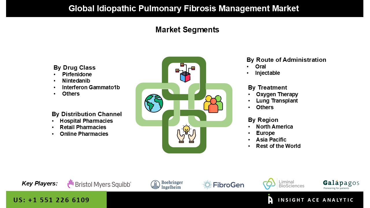 The Idiopathic Pulmonary Fibrosis Management market is segmented based on drug class, route of administration, and distribution channel. The drug class segment comprises pirfenidone, nintedanib, interferon gammato1b, and others. According to the route of administration, the segmention includes oral, injectable, and others. The distribution channel segment includes hospital pharmacies, retail pharmacies, and others.
