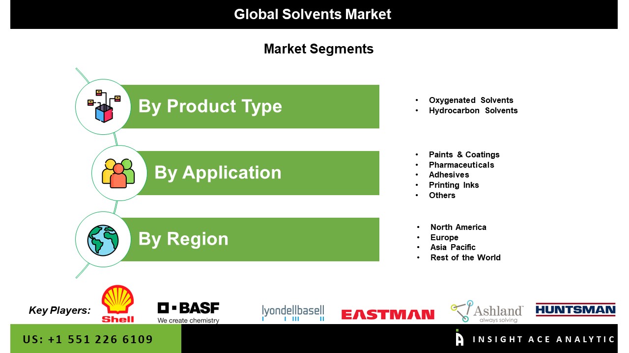 The solvents market is segmented based on product and application. Based on product, the market is segmented as hydrocarbons, alcohol, esters, ketones, chlorinated and others. By application, the market is segmented into printing inks, paints and coatings, pharmaceuticals, adhesives, cosmetics, and others.