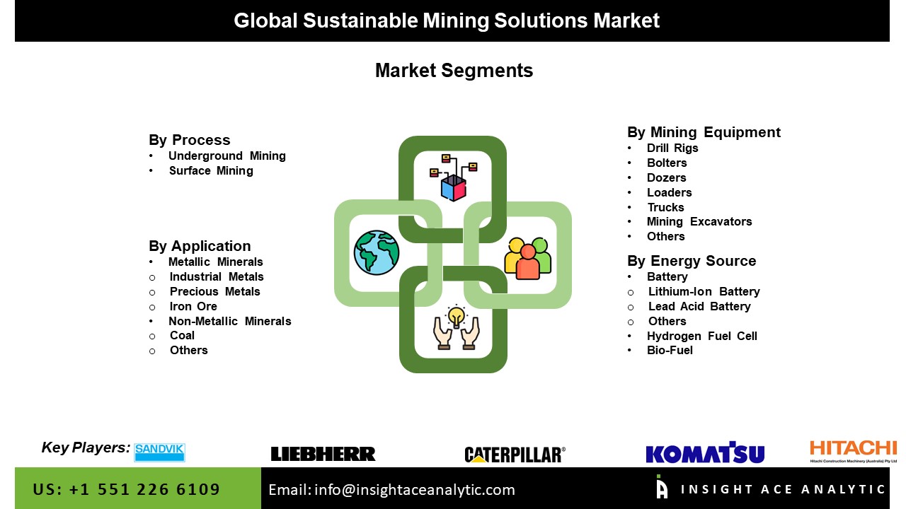 The sustainable mining solutions market is segmented on the basis of application, process, mining equipment, and energy sources. Based on application, the sustainable mining solutions market is segmented into metallic minerals and non-metallic minerals. By process, the market is segmented into underground mining and surface mining. By mining equipment, the market is segmented into drill rigs, bolters, dozers, loaders, trucks, mining excavators and others. By energy sources, the market is segmented into Battery, hydrogen fuel cell and bio-fuel.